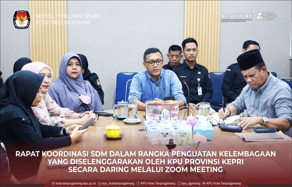KPU Kota Tanjungpinang mengikuti Kegiatan Rapat Koordinasi SDM Dalam Rangka Penguatan Kelembagaan yang diselenggarakan oleh KPU Provinsi Kepulauan Riau secara daring melalui Zoom Meeting, bertempat di Ruang Rapat KPU Kota Tanjungpinang. Rabu, (22/10/2025). Komisi Pemilihan Umum (KPU) Kota Tanjungpinang mengikuti Rapat Koordinasi (Rakor) SDM dalam Rangka Penguatan Kelembagaan yang diselenggarakan secara daring oleh KPU Provinsi Kepulauan Riau. Kegiatan ini merupakan tindak lanjut dari Rakor tingkat nasional yang sebelumnya telah dilaksanakan oleh KPU RI bersama seluruh KPU Provinsi di Indonesia. Rakor dibuka secara resmi oleh Anggota Komisi Pemilihan Umum Provinsi Kepulauan Riau, Ferry Muliadi Manalu. Dalam arahannya, beliau menegaskan pentingnya sinergi kelembagaan antara KPU Provinsi dan KPU Kabupaten/Kota dalam memperkuat tata kelola organisasi serta meningkatkan kualitas sumber daya manusia di lingkungan KPU. Selain menjalankan aspek teknis, KPU juga berperan mengelola potensi konflik sosial agar kehidupan masyarakat tetap harmonis pasca pemilu. Tujuan kegiatan ini adalah untuk memperkuat sinergi antar-satuan kerja, meningkatkan kapasitas SDM, serta menyamakan langkah dalam mendukung kelembagaan KPU yang profesional dan berintegritas. Penyampaian Materi oleh Anggota KPU Provinsi Kepulauan Riau, Jernih Millyati Siregar, menegaskan bahwa pentingnya profesionalisme dan integritas penyelenggara pemilu. Perlu menjaga keutuhan dan marwah KPU sebagai penjaga integritas demokrasi, menekankan bahwa penguatan SDM merupakan kunci utama dalam menjaga kualitas penyelenggaraan pemilu. KPU,akan terus melaksanakan program pelatihan dan pengembangan kelembagaan agar seluruh jajaran siap menghadapi tantangan kepemiluan di masa mendatang dengan tujuan memperkuat kapasitas sumber daya manusia dalam mendukung inovasi kelembagaan serta menjaga kualitas demokrasi di tanah air. Beliau juga menyampaikan ketentuan regulasi terkait cuti dan proses pemberitahuan belajar bagi Anggota KPU Provinsi maupun KPU Kabupaten/Kota. Materi ini dimaksudkan agar seluruh jajaran KPU memiliki pemahaman yang seragam mengenai kebijakan internal, khususnya dalam pengaturan hak dan kewajiban anggota KPU dalam menjalankan tugas serta pengembangan kapasitas diri. Dalam Rakor tersebut juga ditegaskan bahwa KPU berkomitmen untuk senantiasa mendorong para anggotanya melanjutkan pendidikan ke jenjang yang lebih tinggi, baik program Magister maupun Doktoral. Langkah ini menjadi bagian dari strategi penguatan kelembagaan melalui peningkatan kompetensi individu dan profesionalisme penyelenggara pemilu. Kegiatan rapat koordinasi ditutup oleh Plh. Ketua KPU Provinsi Kepulauan Riau, Jernih Millyati Siregar, beliau mengajak seluruh pegawai KPU Provinsi dan KPU Kabupaten/Kota se Provinsi Kepulauan Riau agar terus meningkatkan kinerja dan memperkuat kualitas SDM untuk menghadapi Pemilu dan Pemilihan nanti. Kegiatan ini diikuti oleh, Ketua dan Anggota KPU Kota Tanjungpinang, Sekretaris KPU Kota Tanjungpinang, Pejabat Struktural dan seluruh Staff Sekretariat KPU Kota Tanjungpinang. (Humas KPU Kota Tanjungpinang)