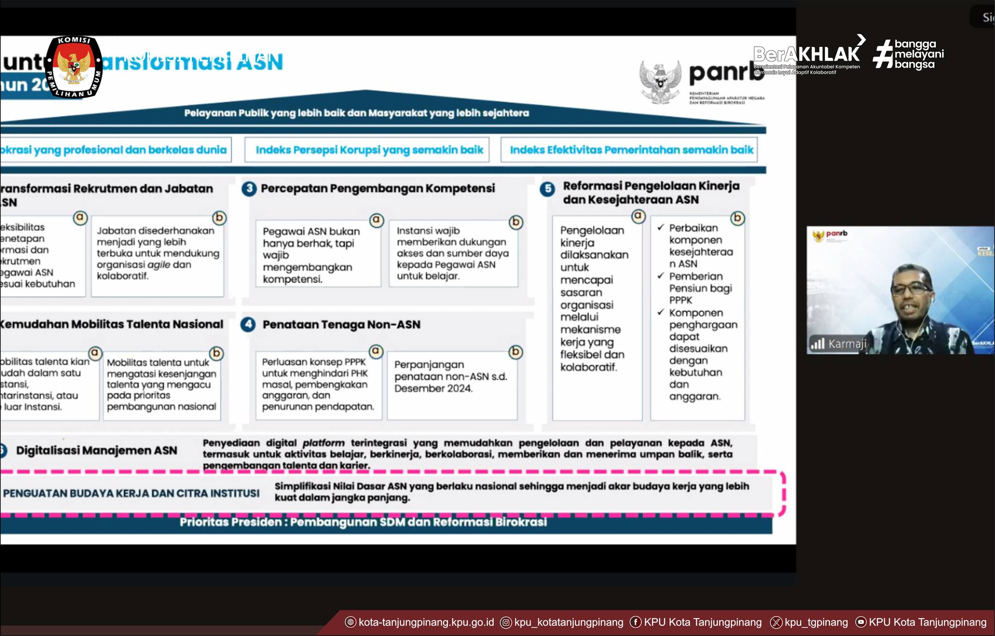 Hadir sebagai Narasumber Kementerian Pendayagunaan Aparatur Negara dan Reformasi Birokrasi (PAN-RB), Karmaji, “Budaya kerja bukan sekadar slogan, tapi harus terasa dalam tindakan sehari-hari.” Kegiatan Knowledge Sharing Budaya Kerja BerAKHLAK jadi bukti nyata komitmen kita membentuk ASN yang profesional, harmonis, dan berorientasi pelayanan. Saya mengajak seluruh peserta untuk tidak hanya hadir secara fisik, tapi juga mengambil pelajaran, praktik baik, dan semangat perubahan dari kegiatan ini. Mari kita internalisasi nilai-nilai BerAKHLAK dalam keseharian kerja, mulai dari hal yang paling sederhana: disiplin waktu, komunikasi yang baik, saling menghargai, hingga inovasi dalam pelayanan. Mendorong internalisasi dan implementasi nilai-nilai BerAKHLAK sebagai budaya kerja utama ASN di seluruh instansi pemerintah. BerAKHLAK merupakan akronim dari Berorientasi pelayanan, Akuntabel, Kompeten, Harmonis, Loyal, Adaptif, dan Kolaboratif. Core value ASN BerAKHLAK merupakan fondasi baru bagi Aparatur Sipil Negara demi terwujudnya satu kesamaan persepsi yang lebih mudah dipahami dan diterapkan oleh seluruh ASN.