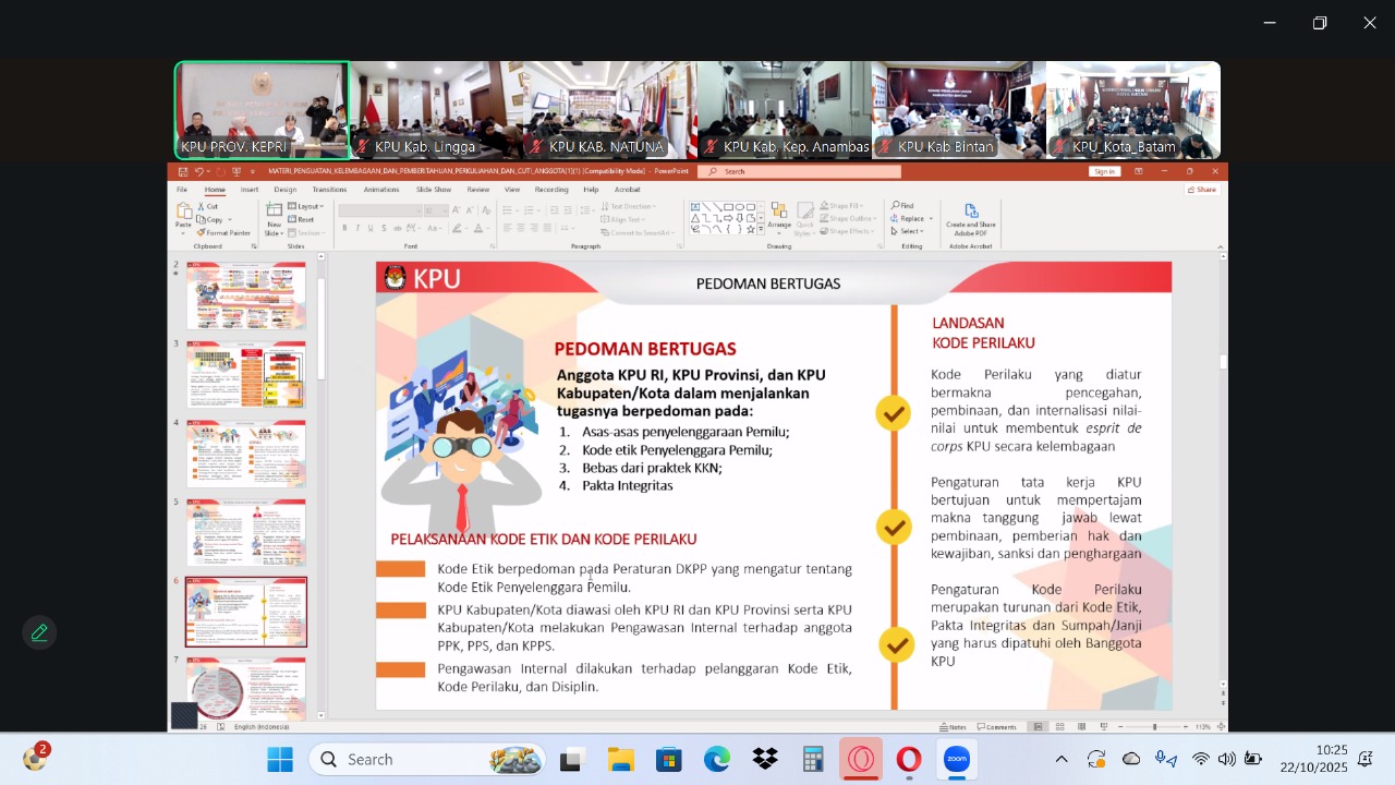 KPU Kota Tanjungpinang mengikuti Kegiatan Rapat Koordinasi SDM Dalam Rangka Penguatan Kelembagaan yang diselenggarakan oleh KPU Provinsi Kepulauan Riau secara daring melalui Zoom Meeting, bertempat di Ruang Rapat KPU Kota Tanjungpinang. Rabu, (22/10/2025).