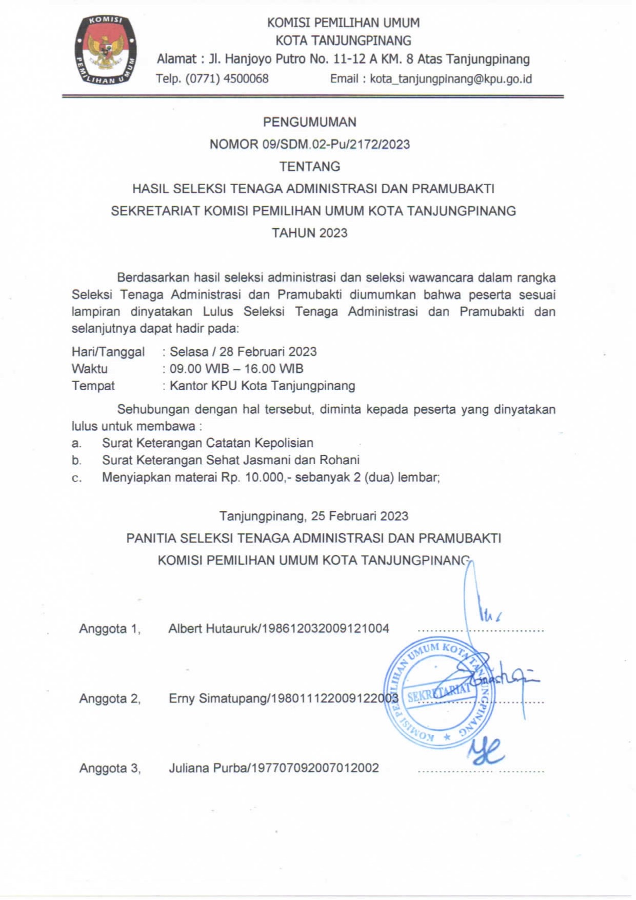 Hasil seleksi administrasi dan wawancara tenaga adminstrasi dan pramubakti sekretariat KPU Kota Tanjungpinang Tahun 2023 dapat didownload disini