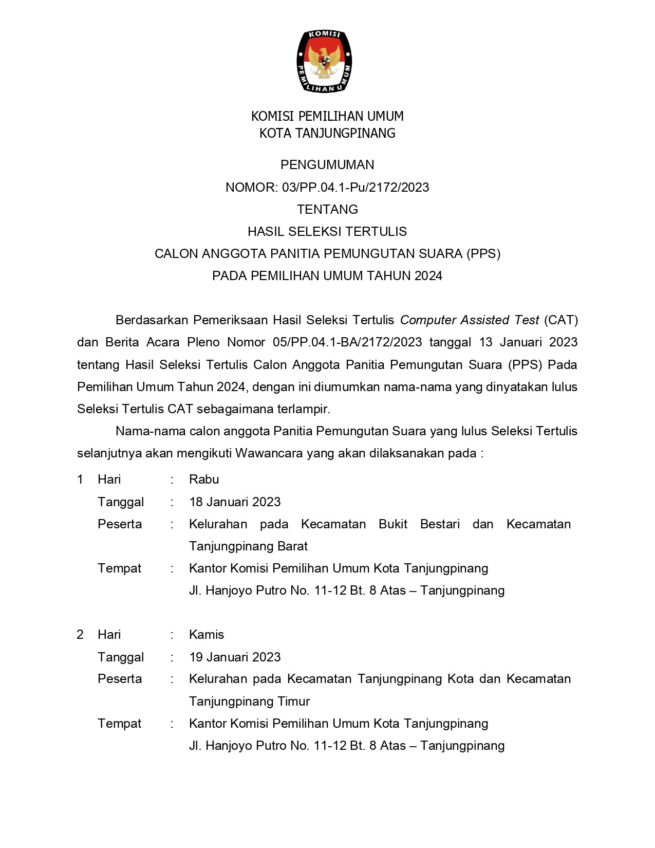 HASIL SELEKSI TERTULIS CALON ANGGOTA PANITIA PEMUNGUTAN SUARA (PPS) PADA PEMILIHAN UMUM TAHUN 2024