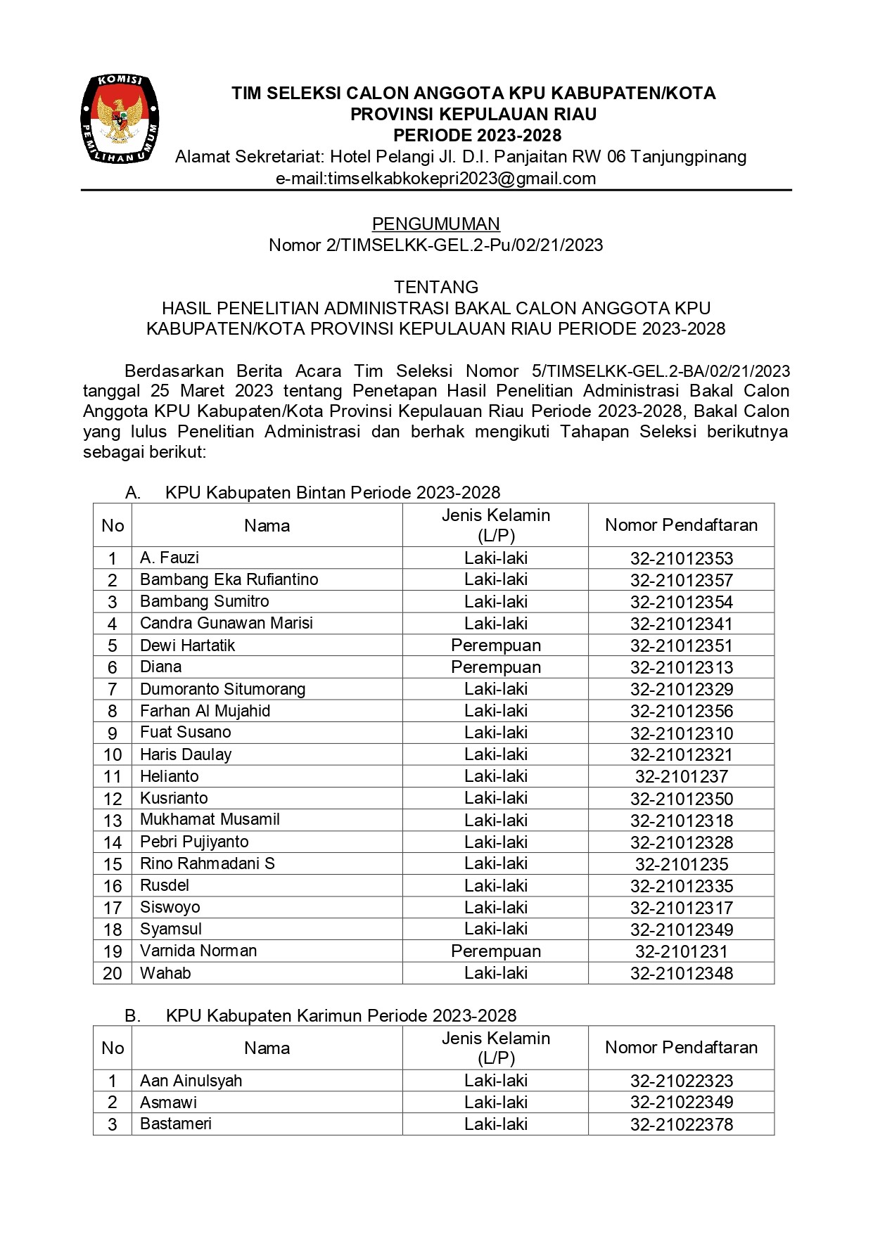 Hasil seleksi administrasi calon anggota KPU Kab/Kota se-Provinsi Kepulauan Riau dapat didownload disini