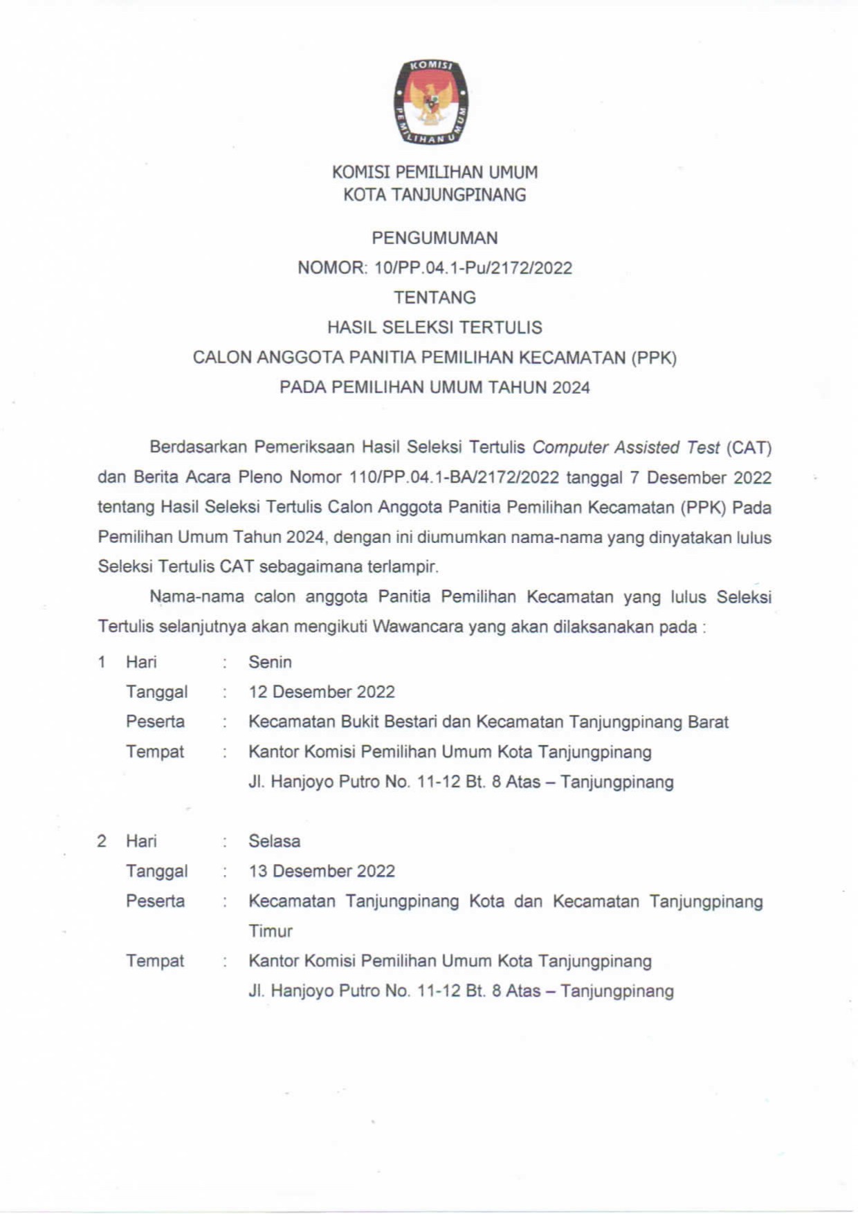 PENGUMUMAN HASIL SELEKSI TERTULIS CALON ANGGOTA PPK PEMILU 2024 Kamis, 08 Desember 2022 07:00 545 Pengumuman selengkapnya dapat dilihat disini Bagikan: Telah dilihat 545 kali