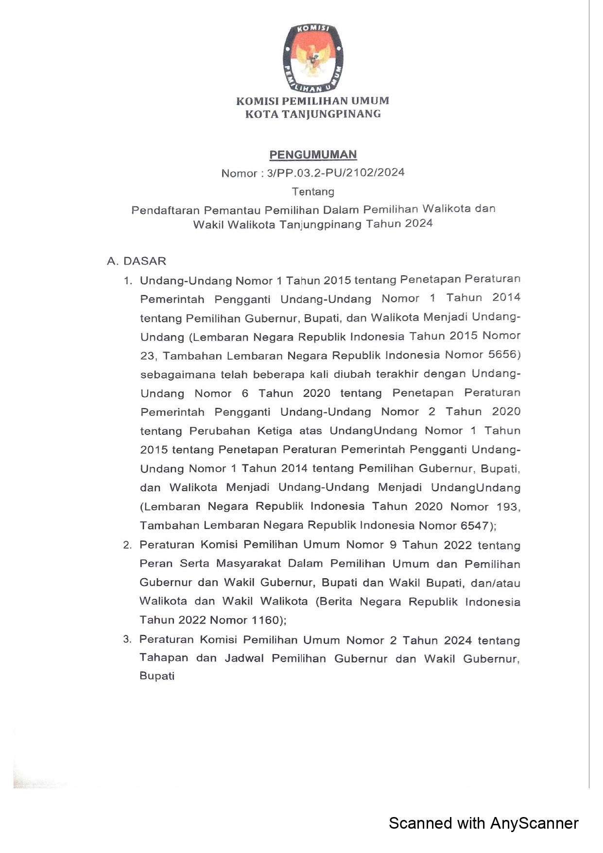 PENGUMUMAN PEMANTAU PEMILIHAN DALAM PEMILIHAN WALIKOTA DAN WAKIL WALIKOTA TANJUNGPINANG TAHUN 2024