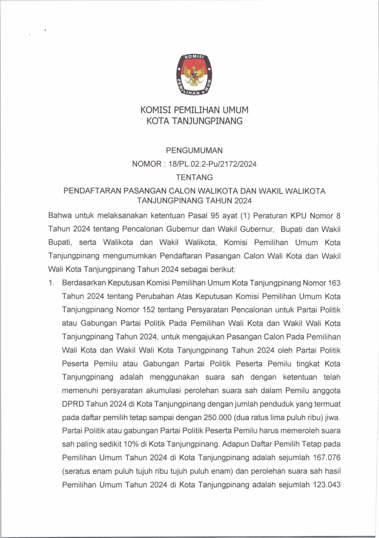 Pengumuman Pendaftaran Bakal Pasangan Calon Wali Kota dan Walikota Tanjungpinang Tahun 2024