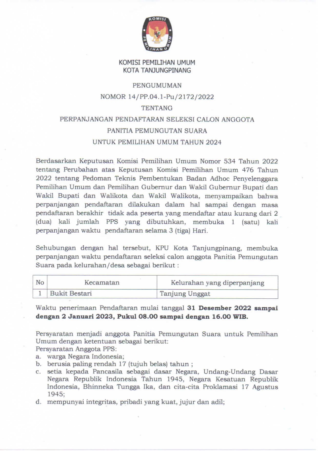 Komisi Pemilihan Umum Kota Tanjungpinang memperpanjang pendaftaran Panitia Pemungutan Suara (PPS) hingga 2 Januari 2023 untuk Kelurahan Tanjung Unggat Kecamatan Bukit Bestari.