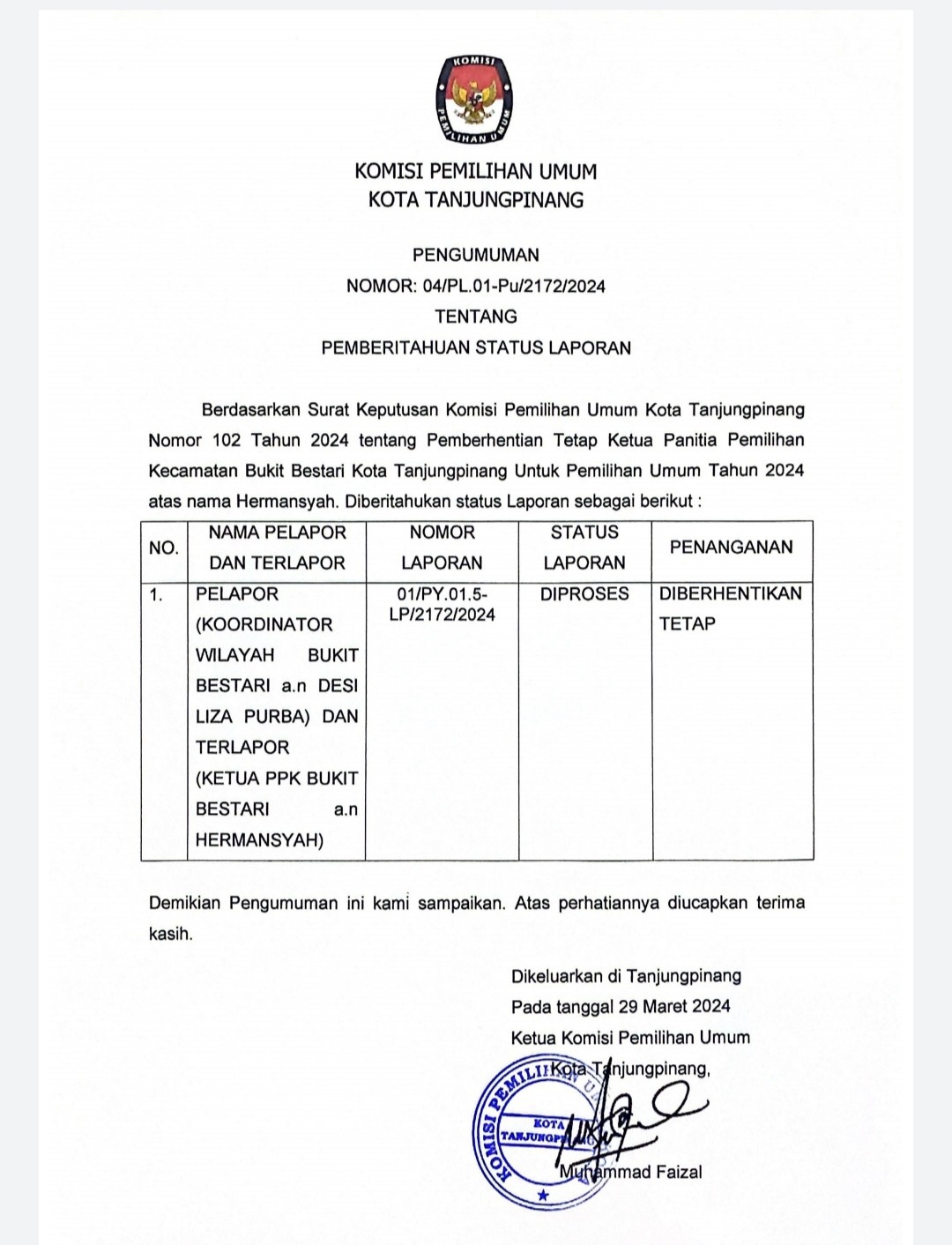 PENGUMUMAN TENTANG PEMBERITAHUAN STATUS LAPORAN Sabtu, 30 Maret 2024 10:00 385 Pengumuman dapat diunduh di sini Bagikan: Telah dilihat 385 kali