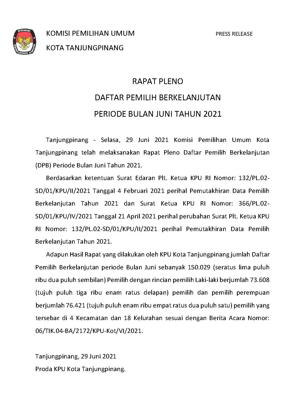 PRESS RELEASE REKAPITULASI PEMUTAKHIRAN DATA PEMILIH BERKELANJUTAN ( PDPB ) BULAN JUNI TAHUN 2021
