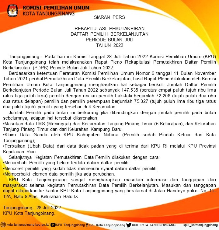 SIARAN PERS PEMUTAKHIRAN DATA PEMILIH BERKELANJUTAN ( PDPB ) PERIODE BULAN JULI TAHUN 2022