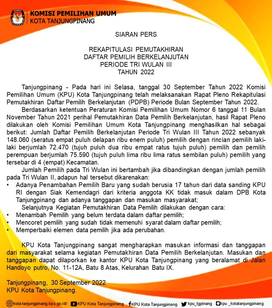 Berdasarkan ketentuan Peraturan Komisi Pemilihan Umum Nomor 6 tanggal 11 Bulan November Tahun 2021 perihal Pemutakhiran Data Pemilih Berkelanjutan, hasil Rapat Pleno dilakukan oleh Komisi Pemilihan Umum Kota Tanjungpinang menghasilkan hal sebagai berikut: Jumlah Daftar Pemilih Berkelanjutan Periode Tri Wulan III Tahun 2022 sebanyak 148.060 (seratus empat puluh delapan ribu enem puluh) pemilih dengan rincian pemilih laki-laki berjumlah 72.470 (tujuh puluh dua ribu empat ratus tujuh puluh) pemilih dan pemilih perempuan berjumlah 75.590 (tujuh puluh lima ribu lima ratus sembilan puluh) pemilih yang tersebar di 4 (empat) Kecamatan.
