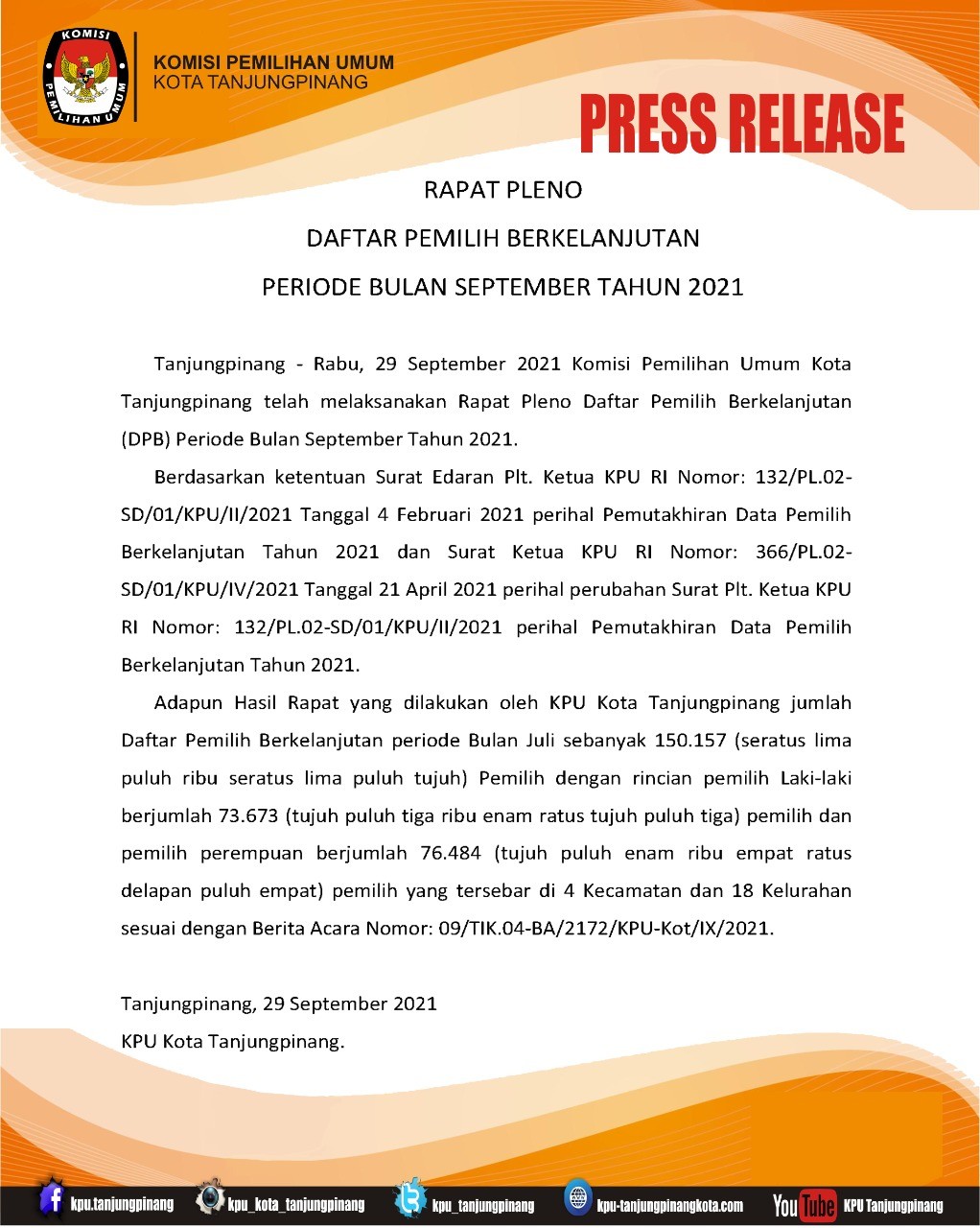 Hai #SobatPemilih. Hari ini telah dilaksanakan Penandatanganan MoU Program Desa (Kelurahan) Peduli Pemilu dan Pemilihan Tahun 2021 antara Walikota Tanjungpinang Hj.Rahmah (Pemko Tanjungpinang) bersamaan Bupati Karimun Bapak Aunur Rafiq (Pemkab Karimun) dengan Ketua KPU Prov Kepri Ibu Sriwati (KPU Provinsi Kepulauan Riau) (14/10/2021) bertempat di Aula Sultan Sulaiman Badrul Alamsyah kantor Walikota Tanjungpinang. Kegiatan ini dihadiri dan di saksikan oleh ketua beserta empat orang anggota KPU Kota Tanjungpinang. Kegiatan juga dilakukan secara Daring langsung yang di hadiri juga oleh ketua KPU Republik Indonesia Bapak Ilham Saputra sekaligus meresmikan dan mengukuhkan kader Desa Peduli Pemilu dan Pemilihan (DP3), serta juga turut hadir Ketua Divisi Parmas Komisioner KPU RI bapak I Dewa Kade Wiarsa Raka Sandi. Di Provinsi Kepulauan Riau, lokus yang menjadi pilot project adalah di Kota Tanjungpinang dan Kabupaten Karimun. Untuk Kota Tanjungpianang, Desa/Kelurahan yang di tunjuk dan tetapkan dalam program DP3 ini adalah Kelurahan Tanjungpinang Timur Kecamatan Bukit Bestari. Kader DP3 sudah direkrut sebanyak 25 orang dari berbagai Basis masyarakat di wilayah Kelurahan Tanjungpinang Timur. #KPUMelayani #PemilihBerdaulatNegaraKuat #DesaPeduliPemiluPemilihan #GerakanSadarPemiluPemilihan