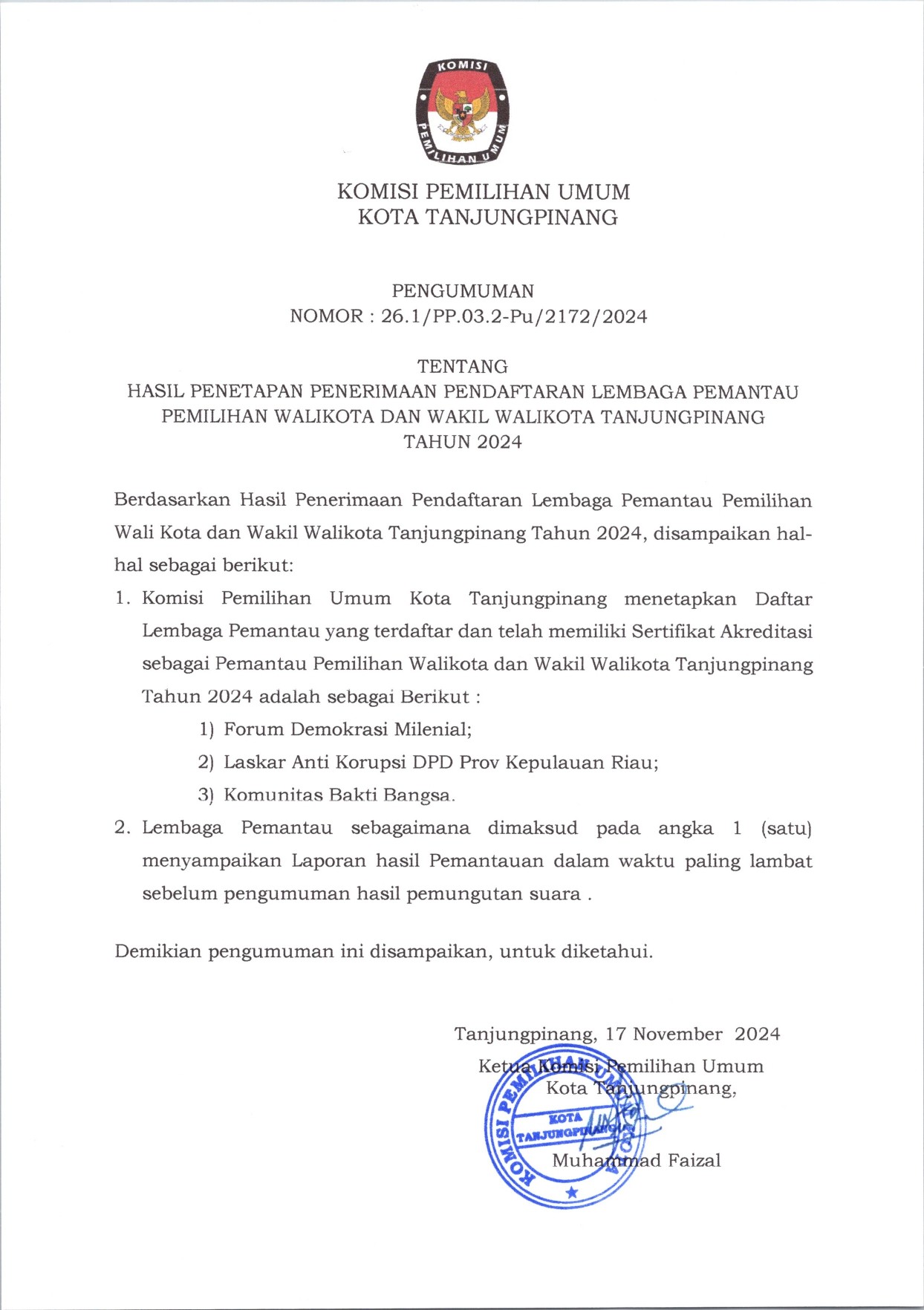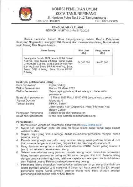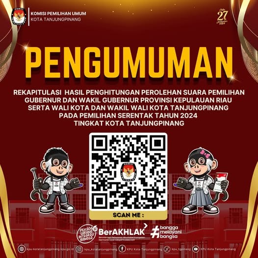 KPU Kota Tanjungpinang telah melaksanakan Rapat Pleno Terbuka Rekapitulasi Hasil Penghitungan Perolehan Suara Pemilihan Tahun 2024 Tingkat Kota Tanjungpinang pada hari Kamis (5/12/2024) di Trans Convention Centre Tanjungpinang. Berdasarkan penghitungan yang dilakukan KPU Kota Tanjungpinang, Pasangan Calon Wali Kota dan Wakil Wali Kota Nomor Urut 1 : Hj. Rahma, S.IP.,MM dan Rizha Hafiz, S.PdI., M.Pd memperoleh hasil sebanyak 29.059 suara dan Pasangan Calon Wali Kota dan Wakil Wali Kota Nomor Urut Nomor Urut 2: H. Lis Darmansyah, S.H dan Drs. Raja Ariza, M.M memperoleh suara sebanyak 64.438 suara.