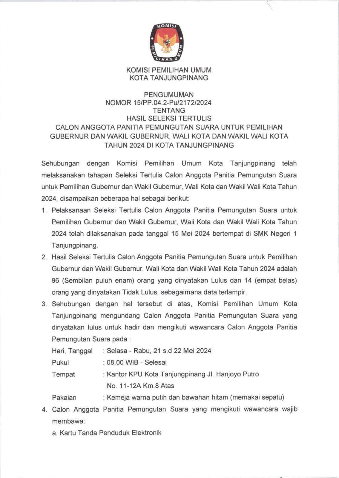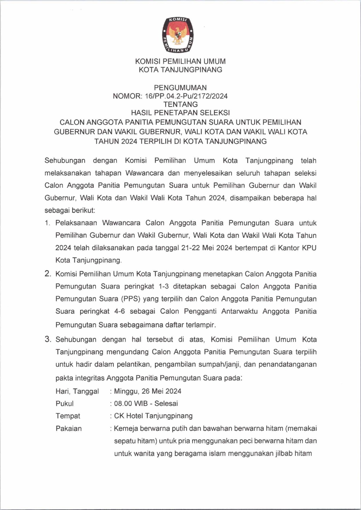 Keputusan Penetapan Calon Terpilih Anggota DPRD Kota Tanjungpinang Pemilu tahun 2024