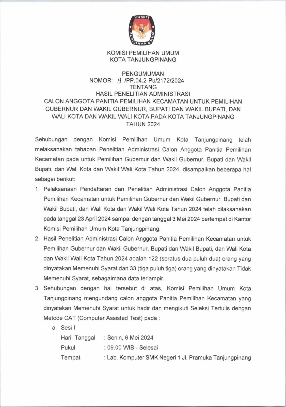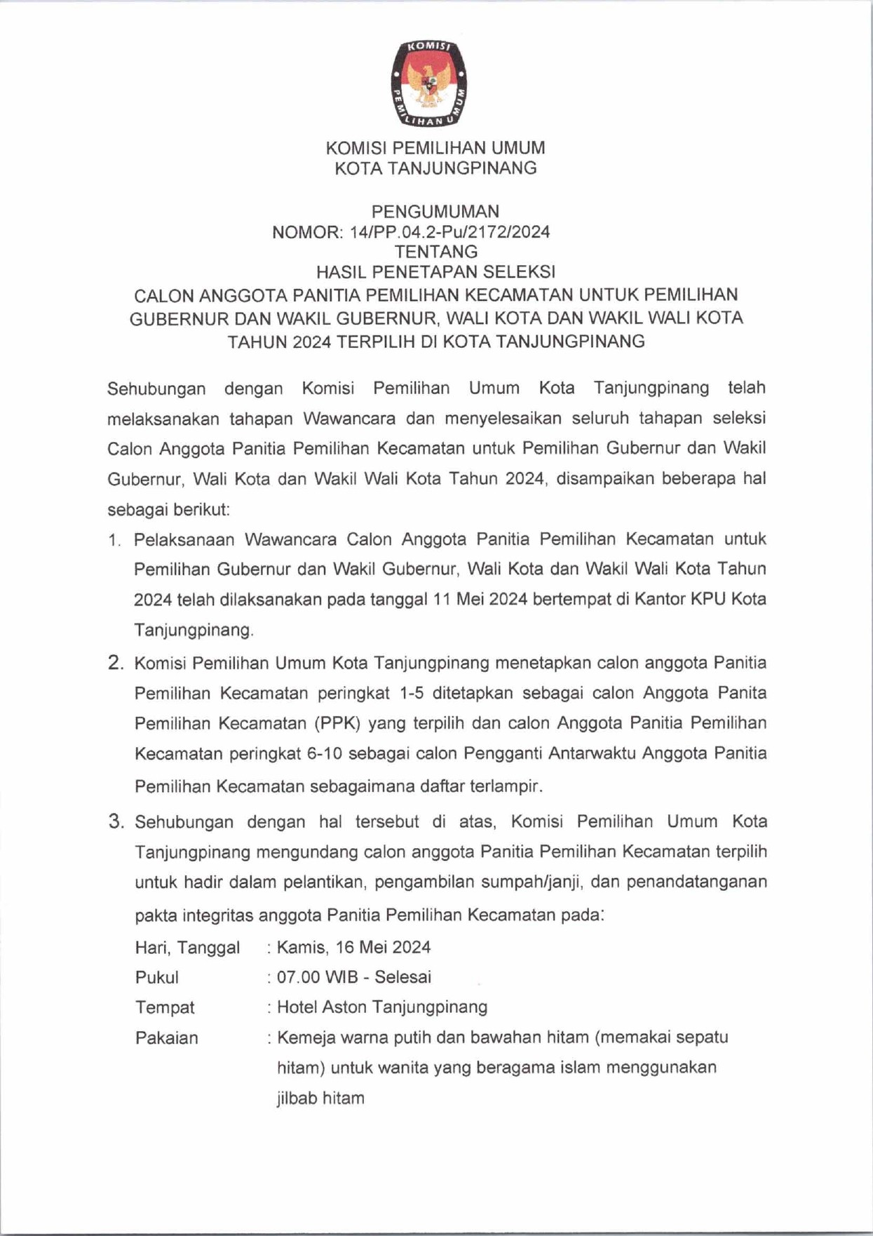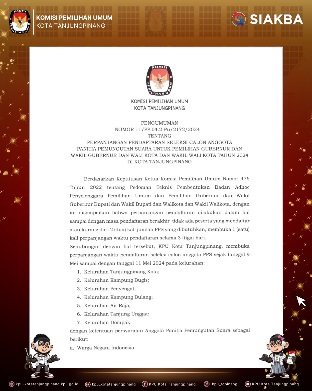 Berdasarkan Keputusan Ketua Komisi Pemilihan Umum Nomor 476 Tahun 2022 tentang Pedoman Teknis Pembentukan Badan Adhoc Penyelenggara Pemilihan Umum dan Pemilihan Gubernur dan Wakil Gubernur, Bupati dan Wakil Bupati dan Walikota dan Wakil Walikota, menyampaikan bahwa perpanjangan pendaftaran dilakukan dalam hal sampai dengan masa pendaftaran berakhir tidak ada peserta yang mendaftar atau kurang dari (dua) kali jumlah PPS yang dibutuhkan, membuka 1 (satu) kali perpanjangan waktu pendaftaran selama 3 (tiga) Hari.Sehubungan dengan hal tersebut, KPU Kabupaten Bintan, membuka perpanjangan waktu pendaftaran seleksi calon anggota PPS sejak tanggal 09 Mei sampai dengan tanggal 11 Mei 2024.