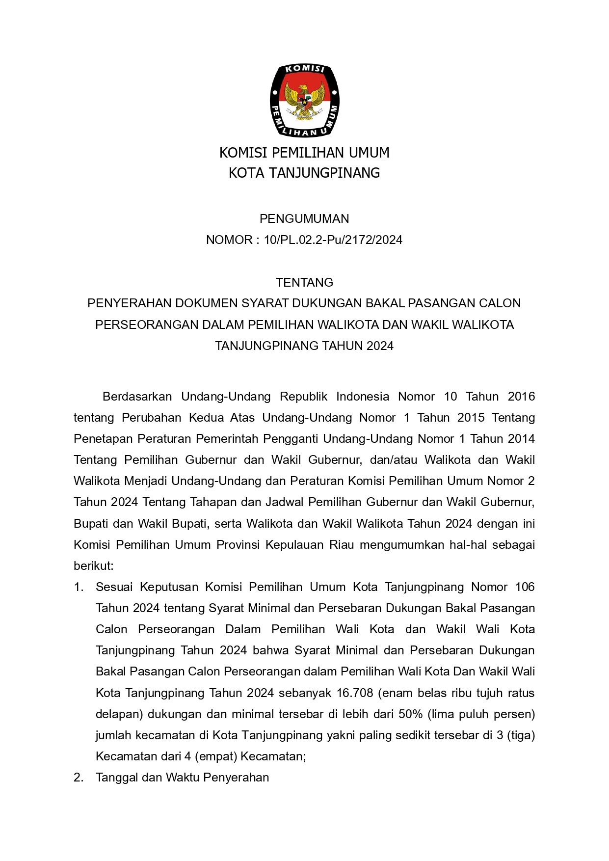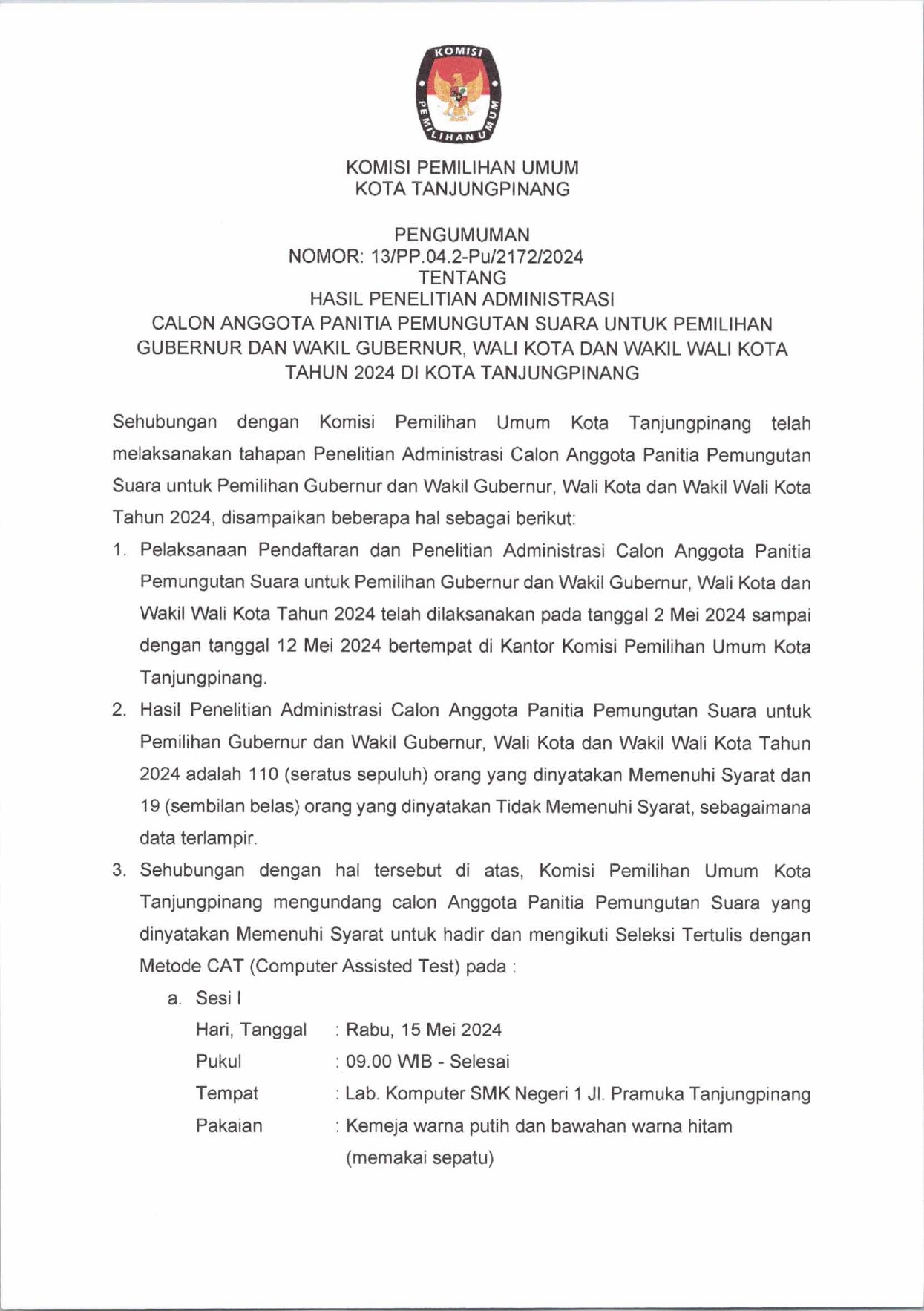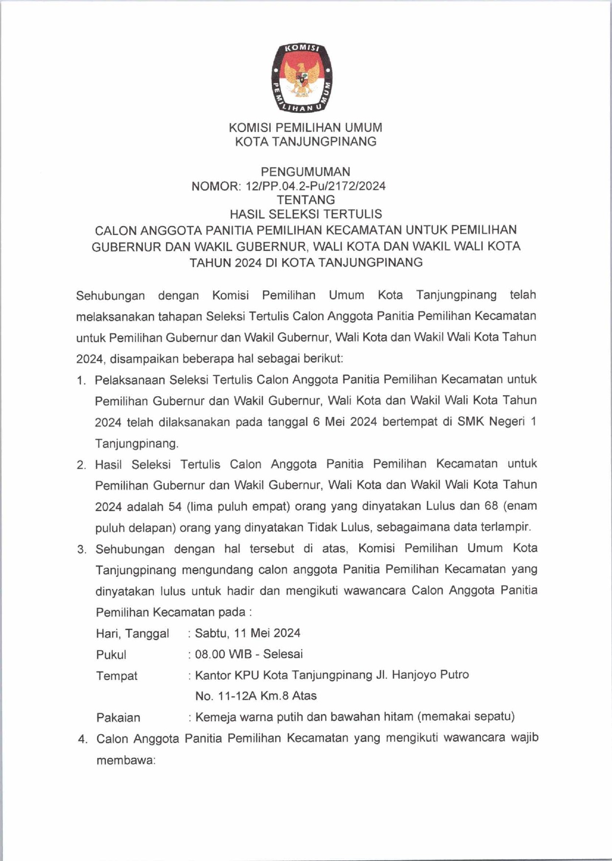 Berdasarkan Keputusan Ketua Komisi Pemilihan Umum Nomor 476 Tahun 2022 tentang Pedoman Teknis Pembentukan Badan Adhoc Penyelenggara Pemilihan Umum dan Pemilihan Gubernur dan Wakil Gubernur, Bupati dan Wakil Bupati dan Walikota dan Wakil Walikota, menyampaikan bahwa perpanjangan pendaftaran dilakukan dalam hal sampai dengan masa pendaftaran berakhir tidak ada peserta yang mendaftar atau kurang dari (dua) kali jumlah PPS yang dibutuhkan, membuka 1 (satu) kali perpanjangan waktu pendaftaran selama 3 (tiga) Hari.Sehubungan dengan hal tersebut, KPU Kabupaten Bintan, membuka perpanjangan waktu pendaftaran seleksi calon anggota PPS sejak tanggal 09 Mei sampai dengan tanggal 11 Mei 2024.
