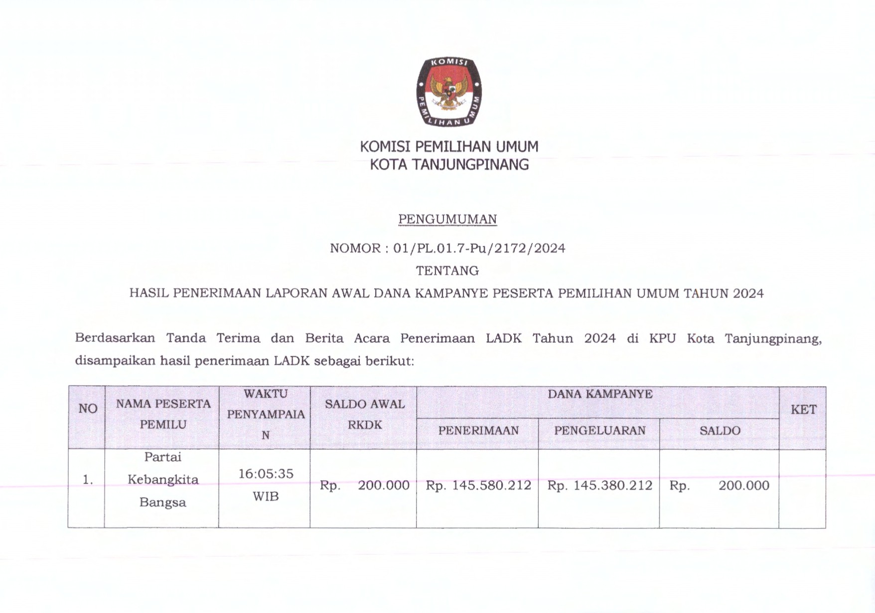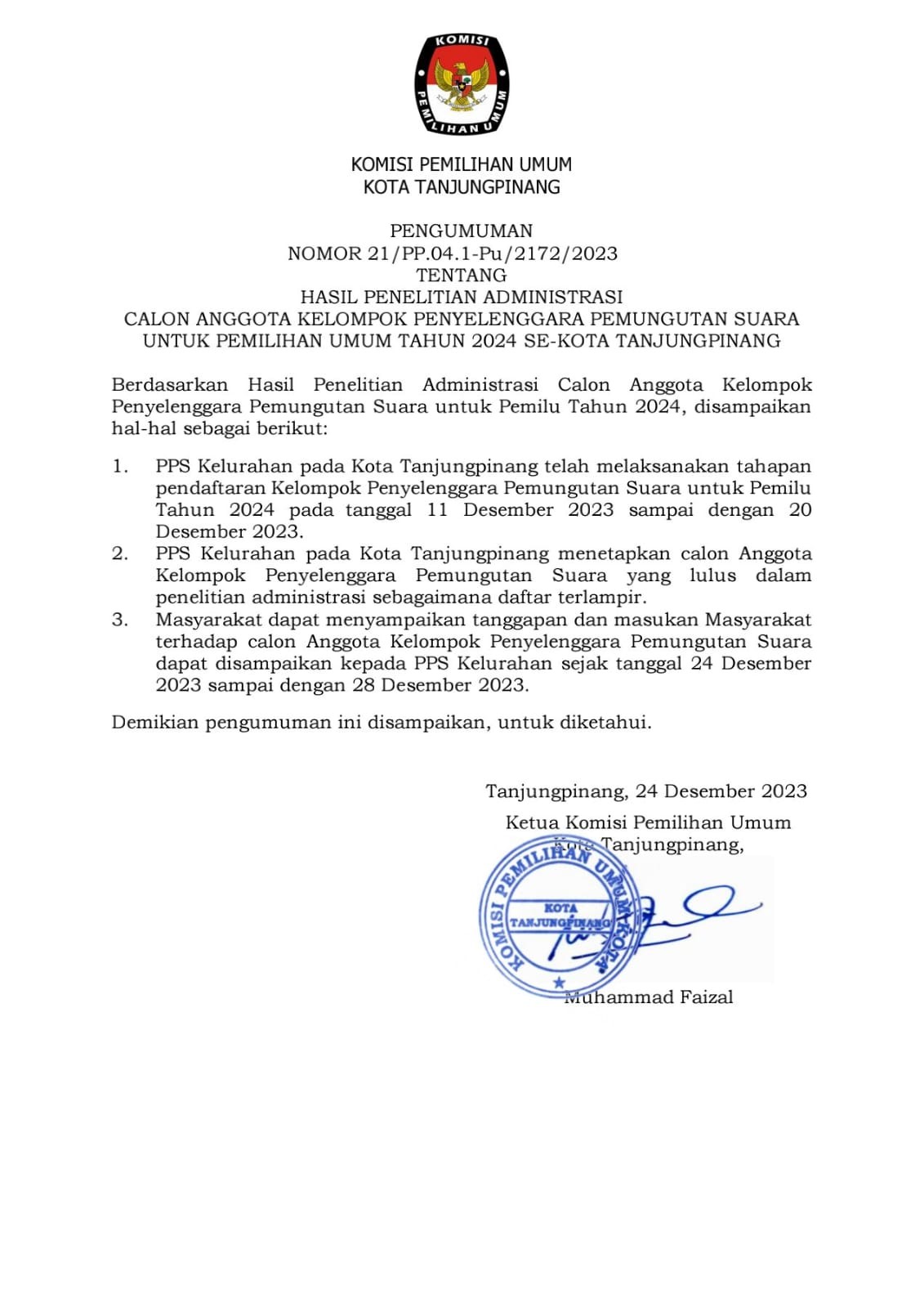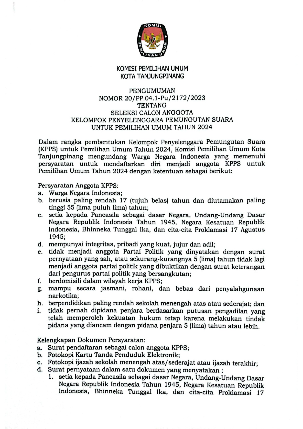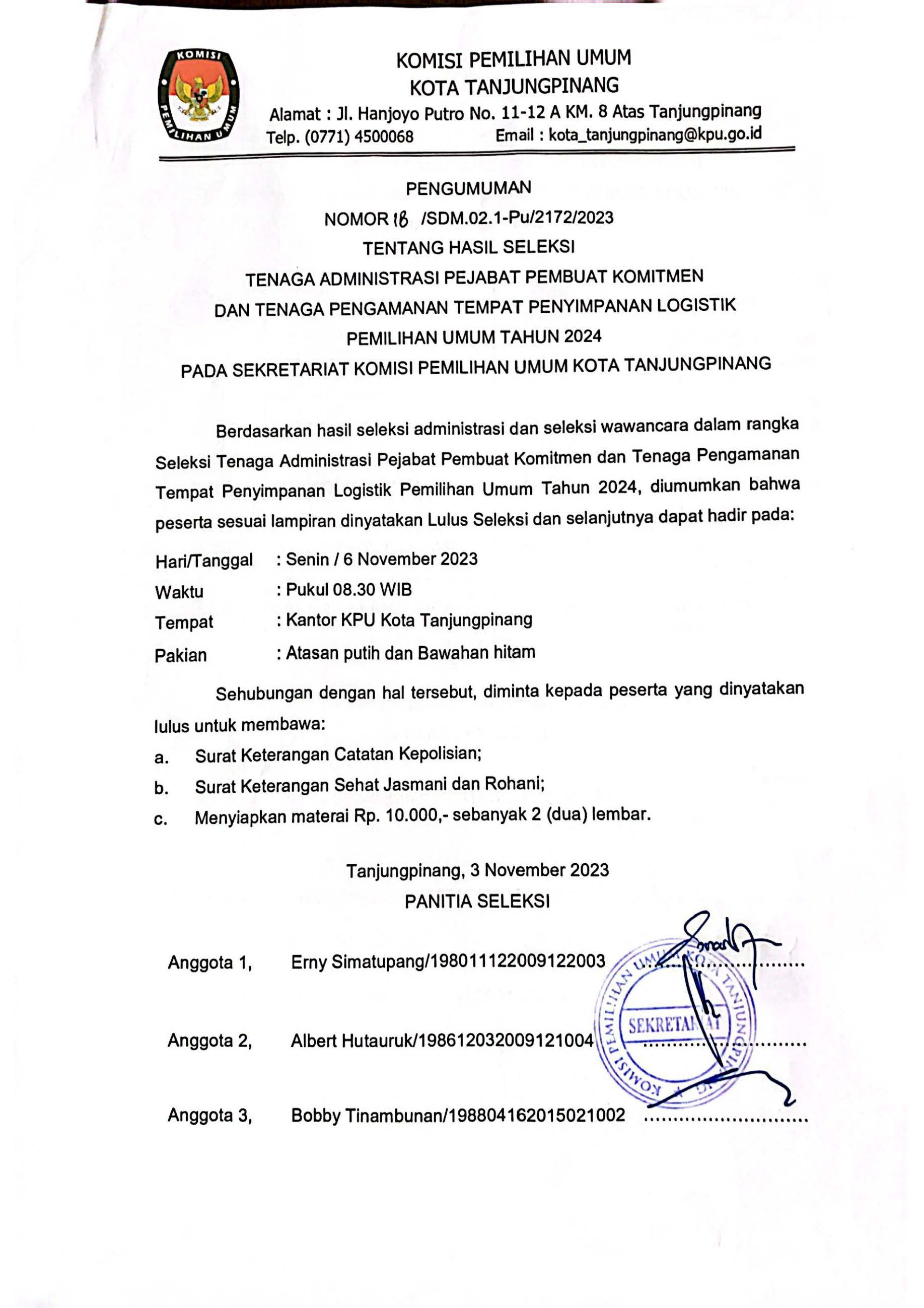 Komisi Pemilihan Umum Kota Tanjungpinang mengumumkan Daftar Calon Tetap (DCT) Anggota Dewan Perwakilan Rakyat Daerah Kota Tanjungpinang dan persentase keterwakilan perempuan dalam DCT pada Pemilu Tahun 2024. Data lengkap calon tetap Anggota DPRD Kota Tanjungpinang juga dapat dilihat melalui portal publikasi https://infopemilu.kpu.go.id/Pemilu dan media sosial KPU Kota Tanjungpinang.